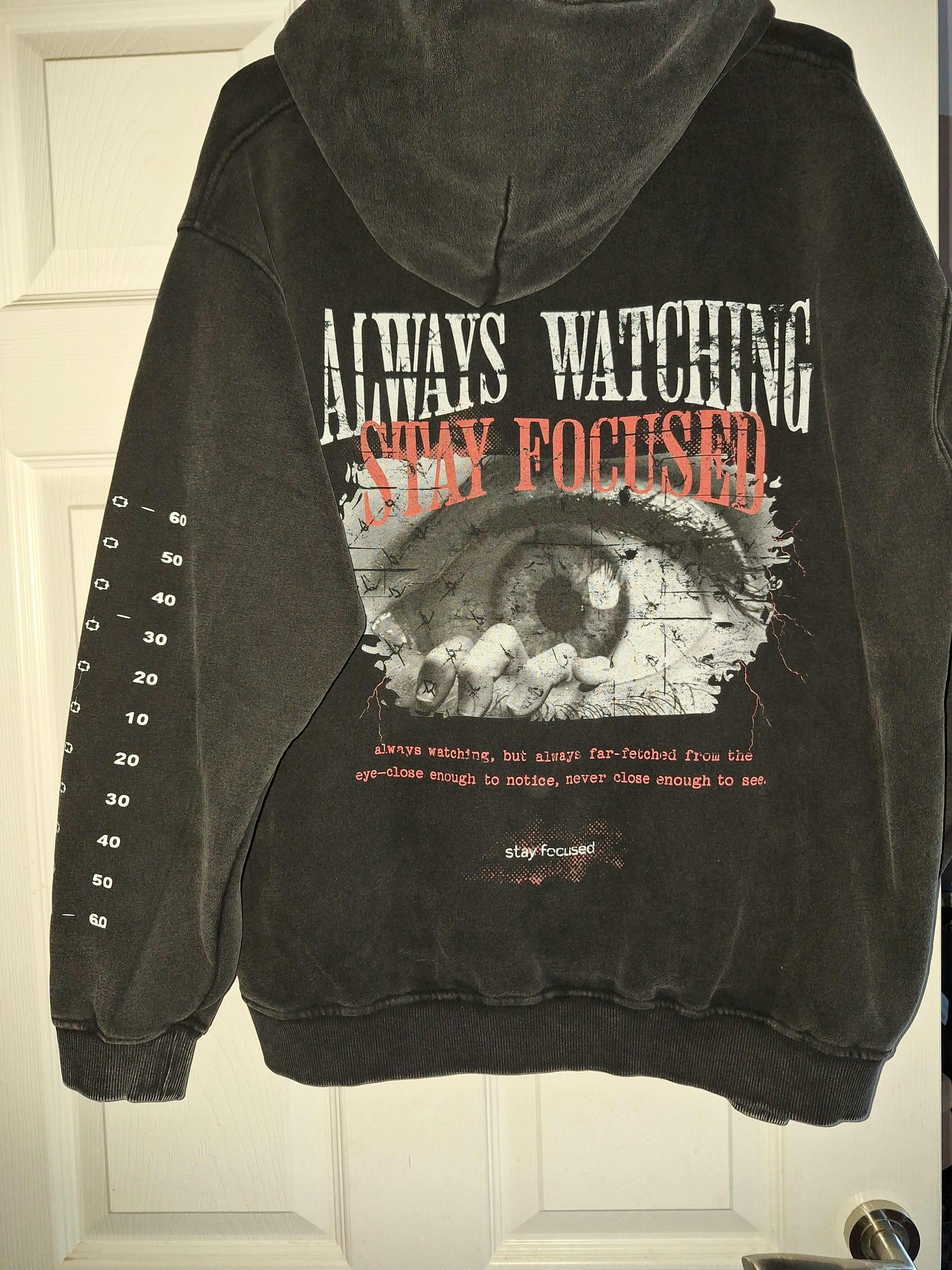 The back graphic keeps the pressure on: ALWAYS WATCHING stamped across the design with a clean, high-contrast look, paired with a striking set of watchful eyes that track everything behind you. Underneath, STAY FOCUSED drives the message home—part warning, part mantra, all attitude.